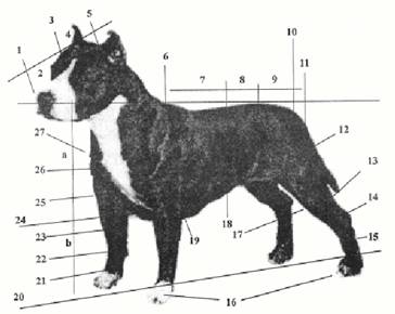 APARÊNCIA GERAL: o American Staffordshire Terrier deve dar a impressão de grande força para seu tamanho; é um cão muito bem estruturado, musculoso, porém, ágil e gracioso e profundamente ligado ao que o cerca. Deve ser compacto, não deve ser pernalta ou esgalgado. Sua coragem é típica.